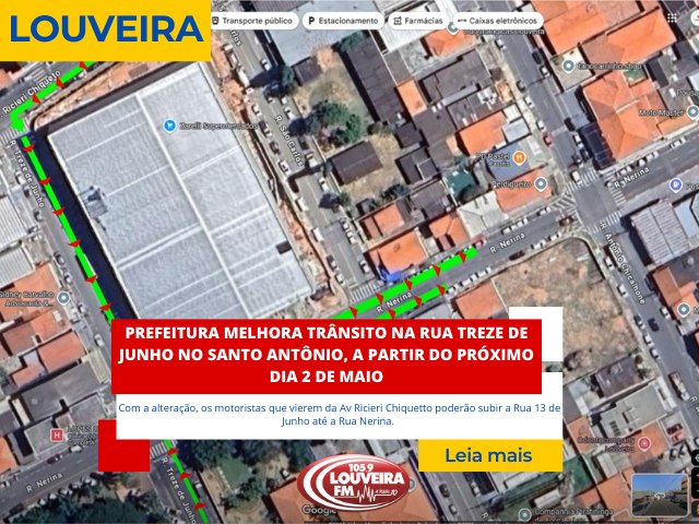 Com a alteração, os motoristas que vierem da Av Ricieri Chiquetto poderão subir a Rua 13 de Junho até a Rua Nerina.