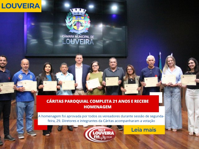 Câmara de Louveira aprovou a concessão de Moção de Congratulações e Aplausos à Cáritas Paroquial, em comemoração aos 21 anos de existência. A homenagem foi aprovada por todos os vereadores durante sessão de segunda-feira, 29. Diretores e integrantes da Cáritas acompanharam a votação.