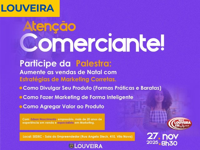 Prefeitura de Louveira, por meio da Secretaria de Desenvolvimento Econômico convida os comerciantes para uma palestra exclusiva com o tema “Aumente as vendas de Natal com Estratégias de Marketing Corretas”. O evento acontecerá no dia 27 de novembro, a partir das 8h30, na Sala do Empreendedor, localizada na Rua Angelo Steck, 410, Vila Nova.