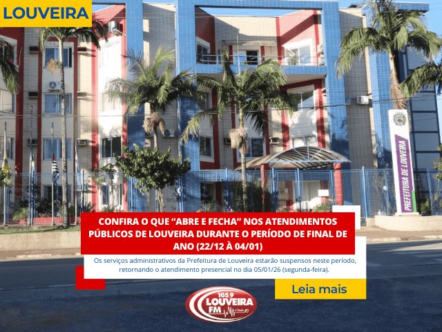 Devido ao recesso de Final de Ano 2025, durante o período de 22/12 à 04/01/26, os atendimentos públicos em Louveira serão realizados de forma diferenciada mas mantendo os serviços essenciais em funcionamento normal.